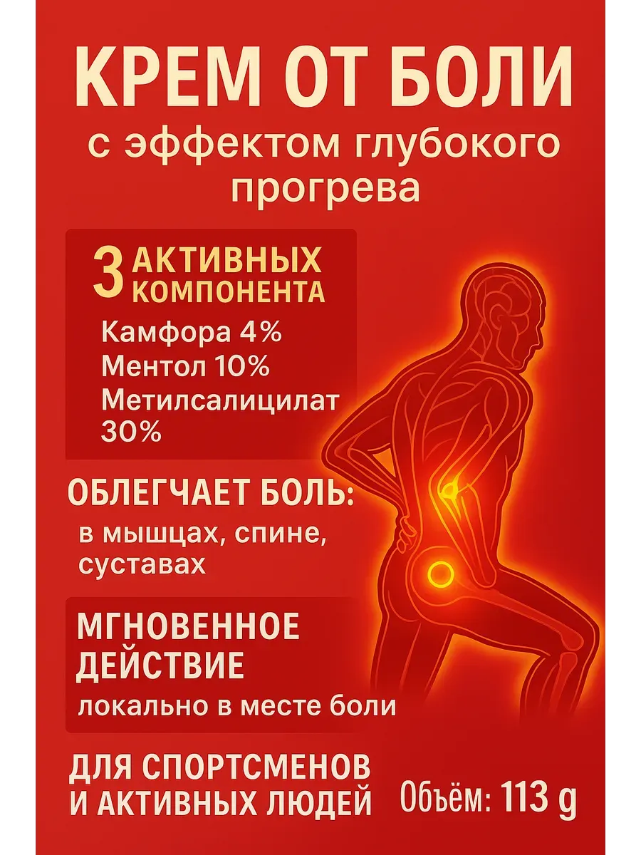 Содержит камфару и ментол — мощные природные обезболивающие компоненты.