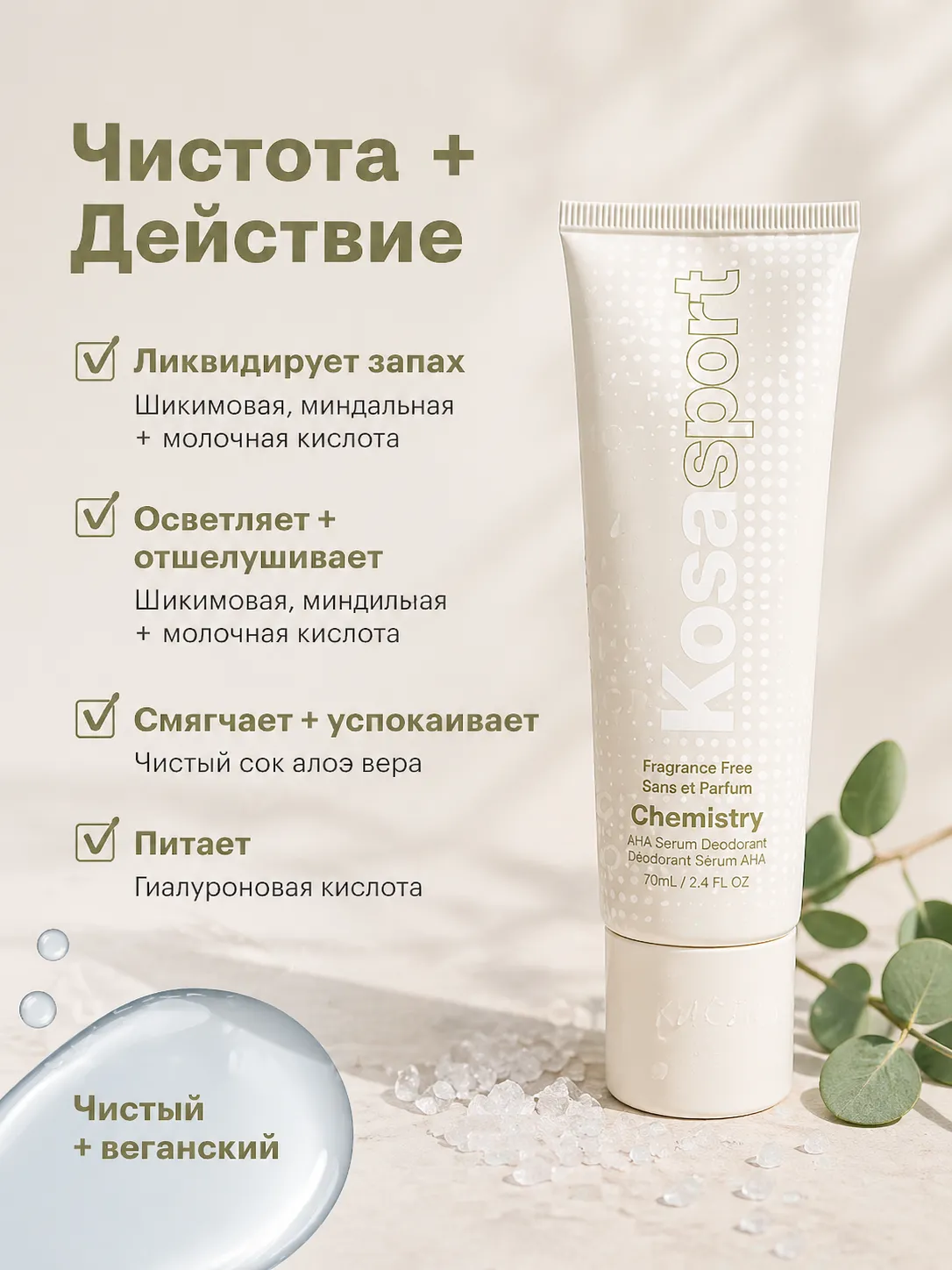 AHA-кислоты (шикимовая, миндальная и молочная) мягко обновляют кожу, помогают нейтрализовать неприятный запах и поддерживают ощущение чистоты и свежести в течение всего дня. Средство работает не за счёт маскировки, а за счёт ухода.