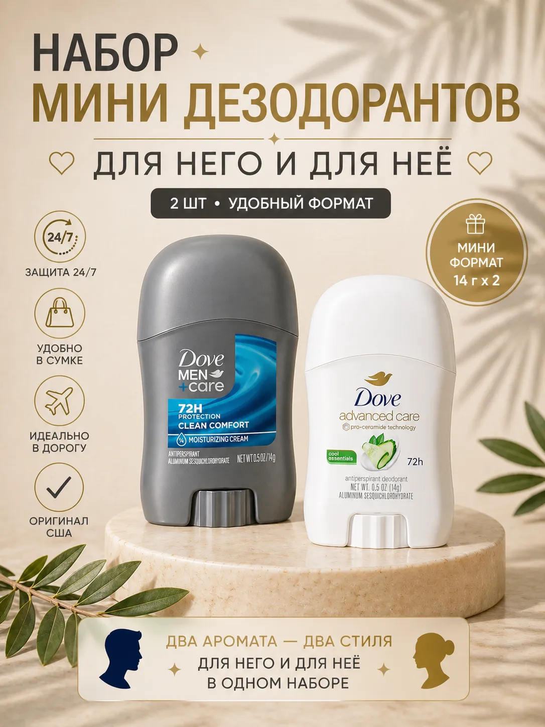 Набор мини дезодорантов Dove 2 шт 14 г для него и для неё