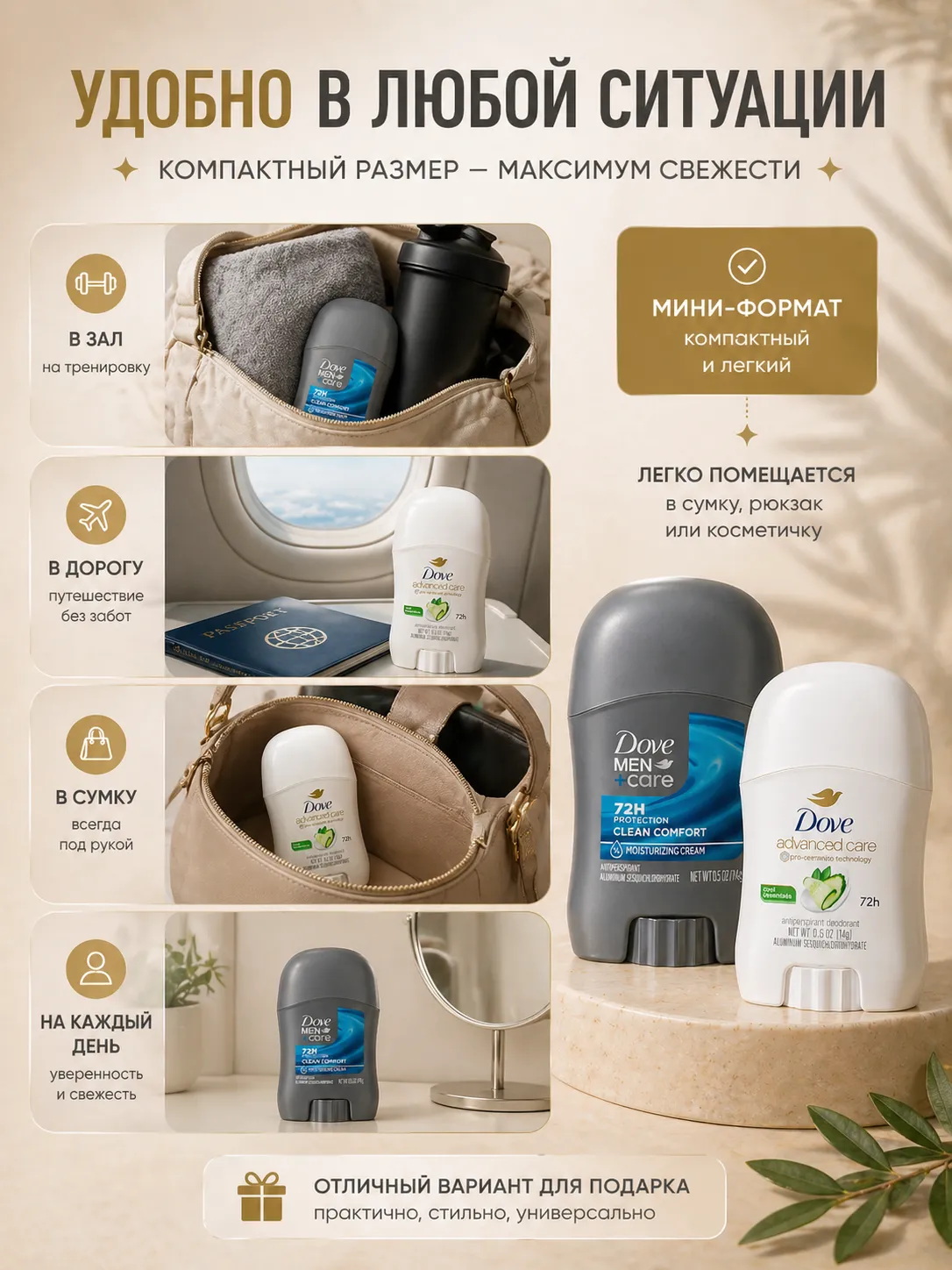 Набор мини дезодорантов Dove — практичный выбор для себя или в подарок.