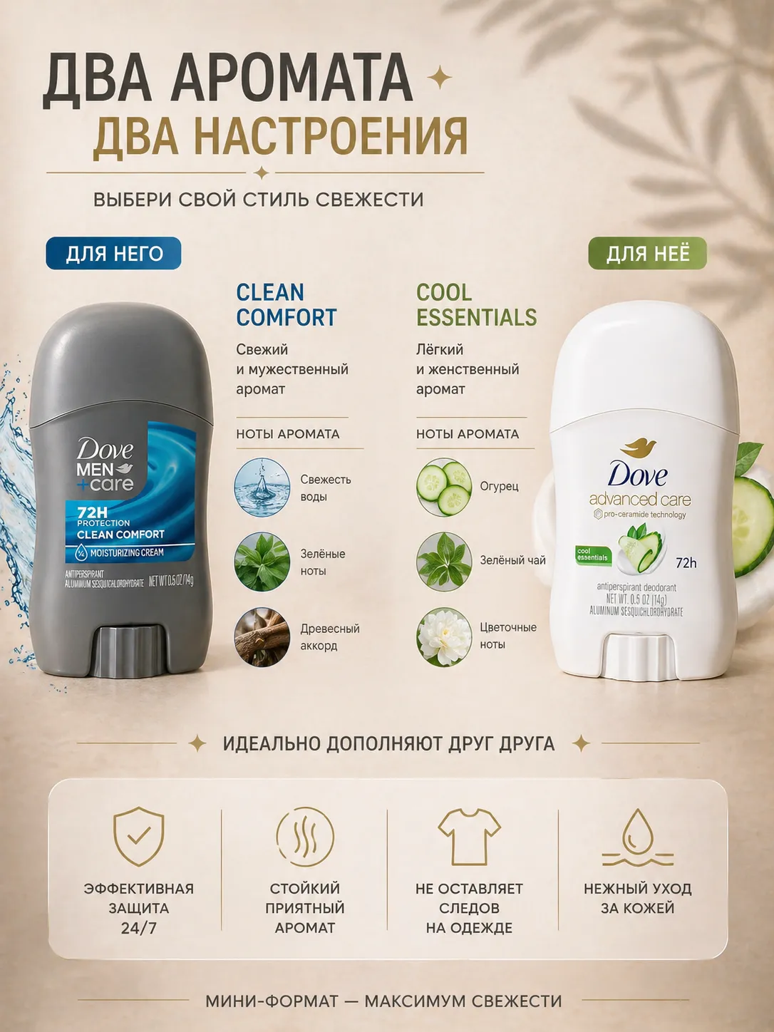 Набор мини дезодорантов Dove — удобное решение для него и для неё в одном комплекте. В наборе 2 стика по 14 г: мужской Dove Men+Care Clean Comfort и женский Dove Advanced Care Cool Essentials. Идеальный формат для повседневного использования, поездок, спортзала и сумки.