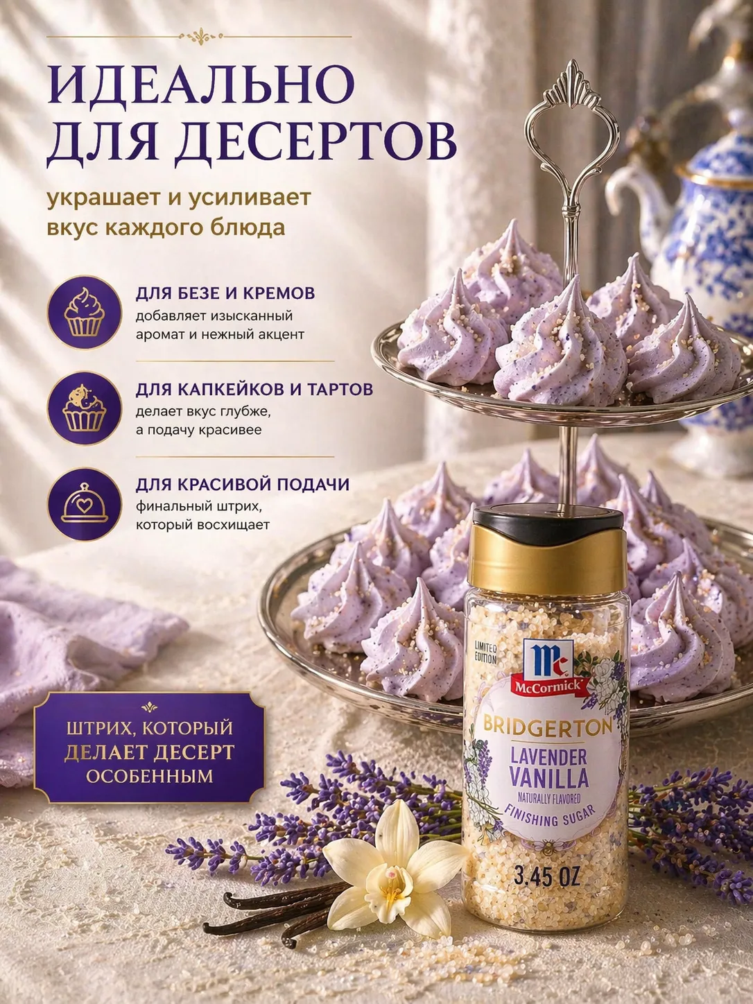 Сахар для десертов McCormick Bridgerton Lavender Vanilla — это премиальный finishing sugar с утончённым ароматом лаванды и ванили, созданный для финального оформления блюд.