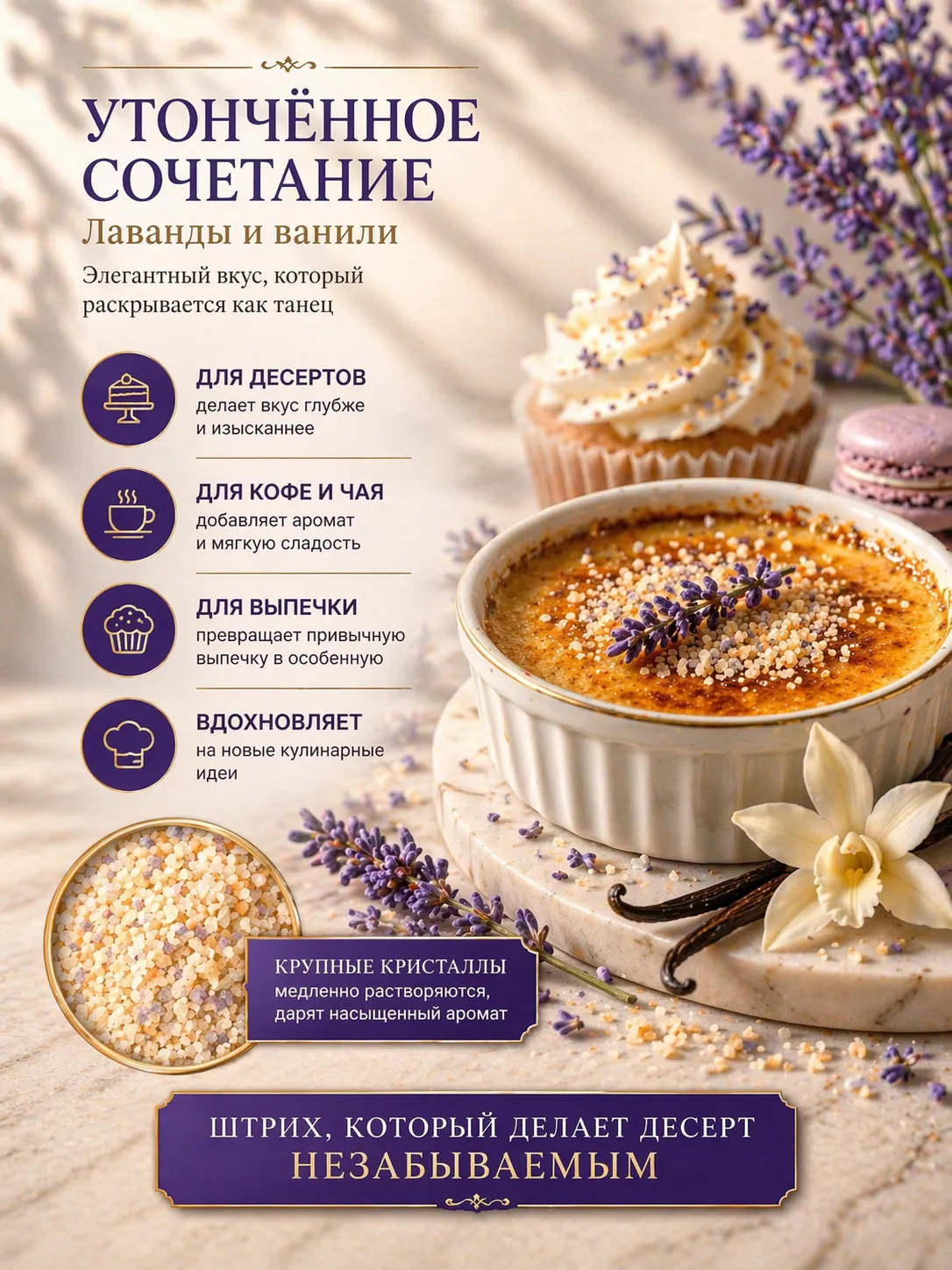 Сахар с лавандой и ванилью используется как финальный штрих — улучшает подачу, усиливает вкус и делает десерт визуально привлекательным. Отлично подойдёт для домашней выпечки, кондитерских изделий и красивой сервировки.